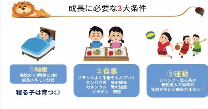 睡眠・・・眠ってる間(特に22時~2時)に成長ホルモン が分泌されます。